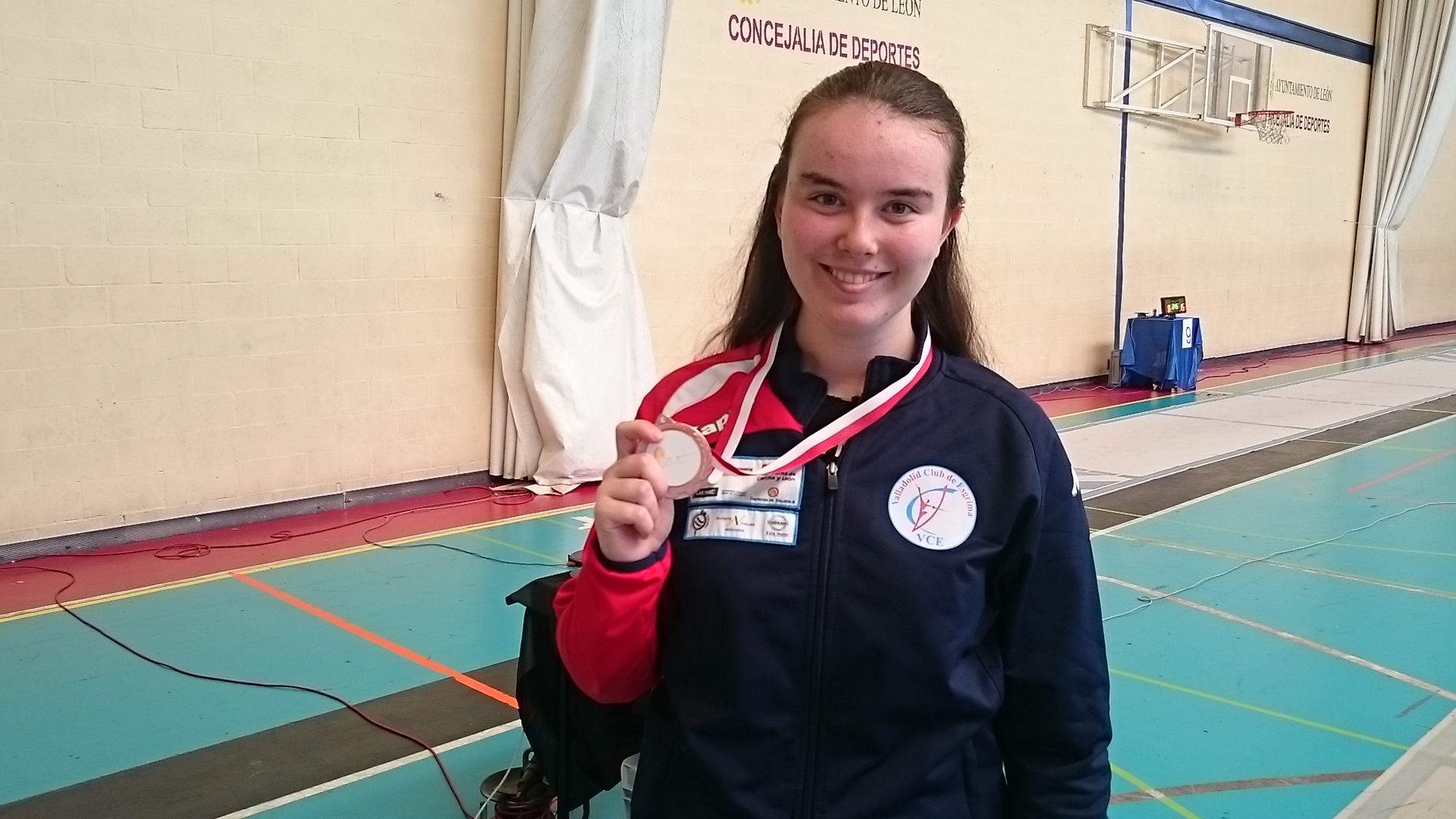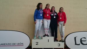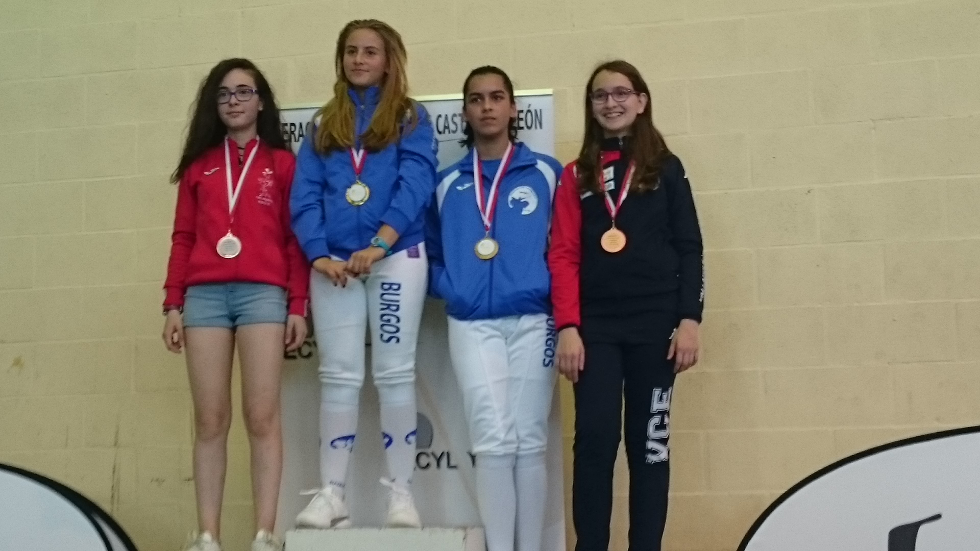 En ESPADA FEMANINA, la única participante del VCE era María Mateos que en la fase de grupos, vencía 4 asaltos y una sola derrota, pasando con el número 2 a la fase de clasificación donde tras vencer primero a las burgalesas Sara González del Cid y luego a Naiara Rodríguez del SAES, se metió rápidamente en la final. Efrentada a Inés Martín del Segovia, el asalto fue para María, que tras un 15 a 10, ganaba el ORO y se proclamaba CAMPEONA Junior/M20 de Castilla y León.