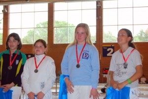 En chicas llegó la primera medalla. María Espinel solamente vencía 1 asalto y terminaba la 57, Inés Martín puntuaba 2 victorias y 4 derrotas y terminaba 43; Carmen Gil, con 3 victorias y 3 derrotas, terminaba 37; y Elisa Martínez, con 3 victorias y 3 derrotas terminaba 26 pero 6º en la clasificación de su año, lo cual le daba acceso al único cruce de las medallas. No hubo suerte y perdió 6 a 10 ante la madrileña Calvo, quedándose con la plata.