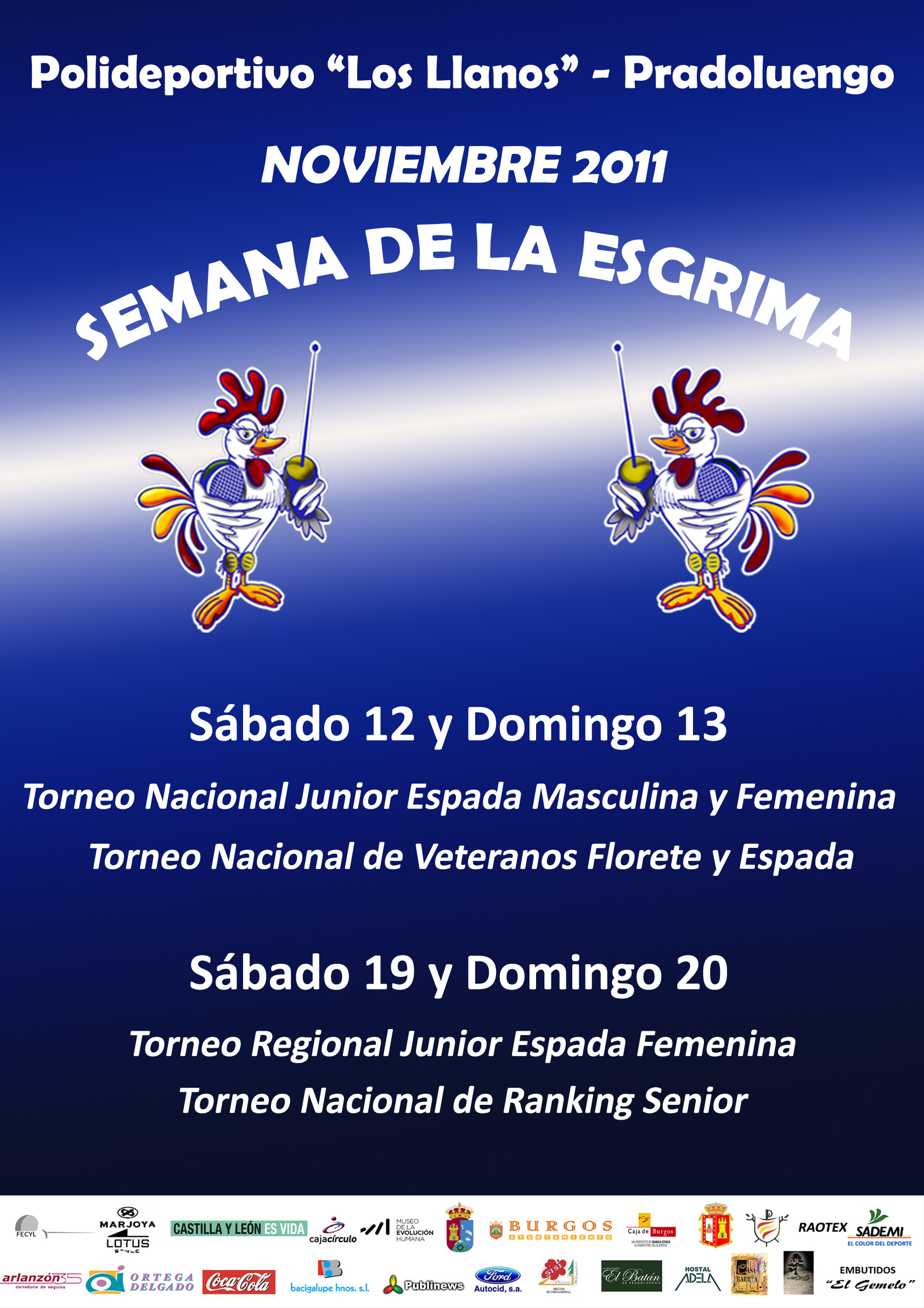 En la localidad burgalesa de Pradoluengo tedrá lugar durante los dos próximos fines de semana diversos torneos nacionales y regionales en varias categorías. Comienza la competición el sábado 12 de noviembre con un nuevo Torneo Nacional Junior, donde esperemos se repitan las medallas que se consiguieron en Amposta. Al día siguiente tendrá lugar el primer torneo de espada de la temporada en la categoría de los más sabios: los veteranos.