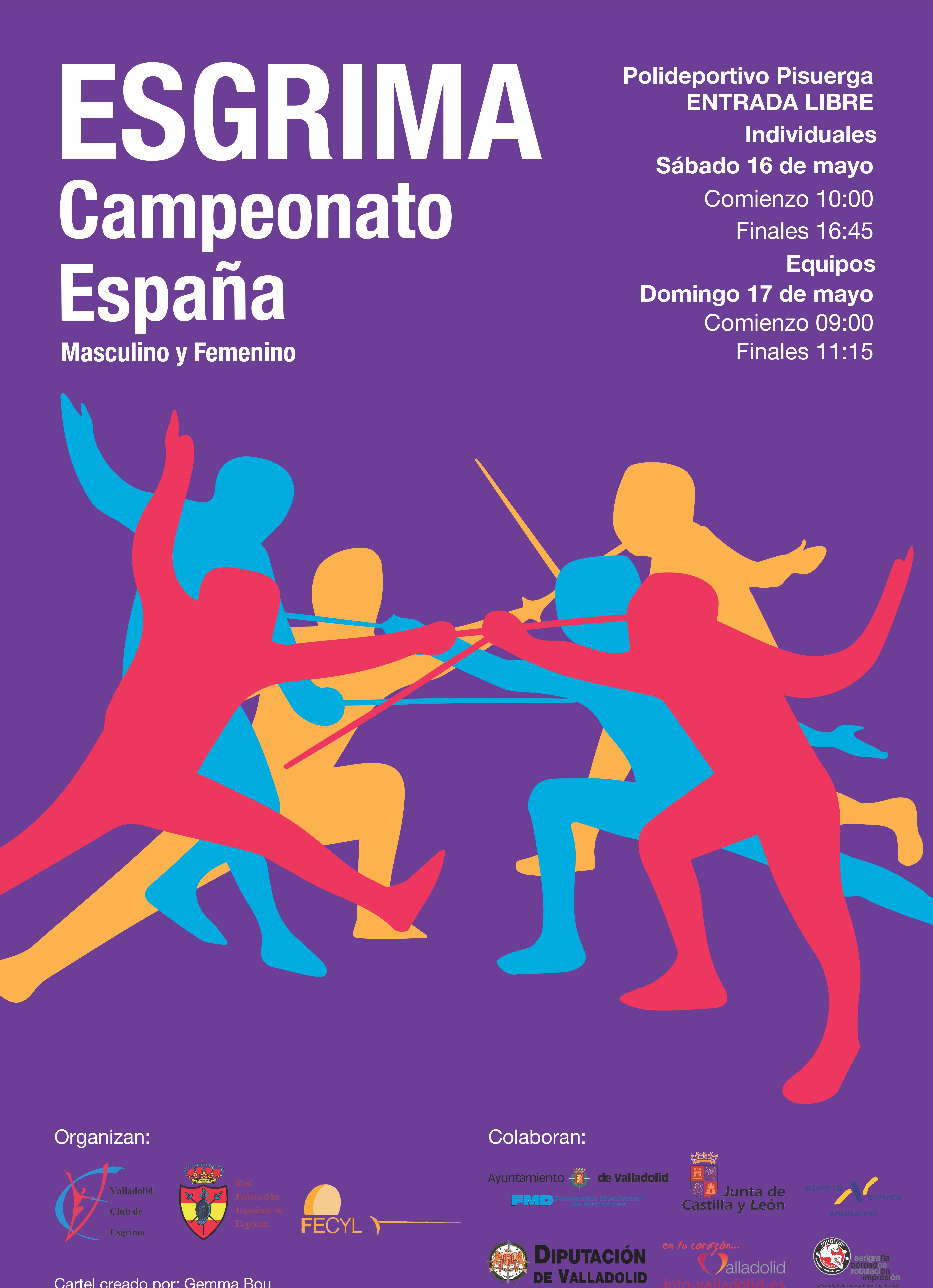 Este fin de semana, aquí en Valladolid, por segunda vez consecutiva se celebrará el Campeonato de España Absoluto en todas las armas. El Valladolid Club de Esgrima logró clasificar entre los 28 mejores de España a Yonier de la Caridad Pérez y Adrián Yáñez en espada masculina, a las cadetes Inés Martín y María Mateos en espada femenina y a Fernando Casares en sable masculino. Además en la competición por equipos partiendo con el número 1 estará el de la espada femenina. El sábado tendrá lugar la competición individual y el domingo la de equipos. Podéis pinchar sobre el cartel para obtener más información, y para empezar: aquí las poules. MUCHÍSIMA SUERTE A TODOS LOS PARTICIPANTES.