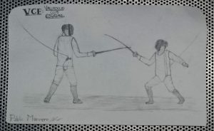 Pablo Marinero, hizo un dibujo a lápiz de dos esgrimistas del VCE haciendo un asalto. Seguramente él contra Víctor (siempre se buscan para enchufarse juntos)