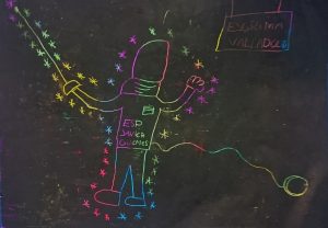 Mientras Javier, con las ceras Manley, primero a un folio blanco le dio colores para hacer el fondo y después tapó todo con cera Manley negra. El dibujo resultante, es producto de rayar la pintura negra haciendo el dibujo, para mostrar el color de abajo. El esgrimista con todo detalle.