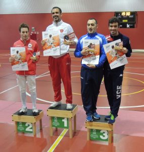Bermejo con 5V y 1D y Merino con las mismas, pasaron tras las poules con los números 3 y 5. Exentos, superaron las primeras eliminatorias hasta entrar en la final de 8, donde Juanra cayó con Germán Ruiz de Bilbao por 15 a 10 finalizando en la 5ª posición, mientras su compañero ganaba a Pacheco de Santander clasificándose para las semis. Ya en el podium, contra Yago Navarro del CNE, cae por un apretadísimo 15 a 14, ganándose un merecido BRONCE.