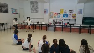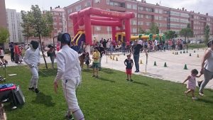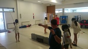 La pequeña exhibición en el patio, pretendía mostrar también a las familias como se desarrolla un asalto de esgrima en competición.