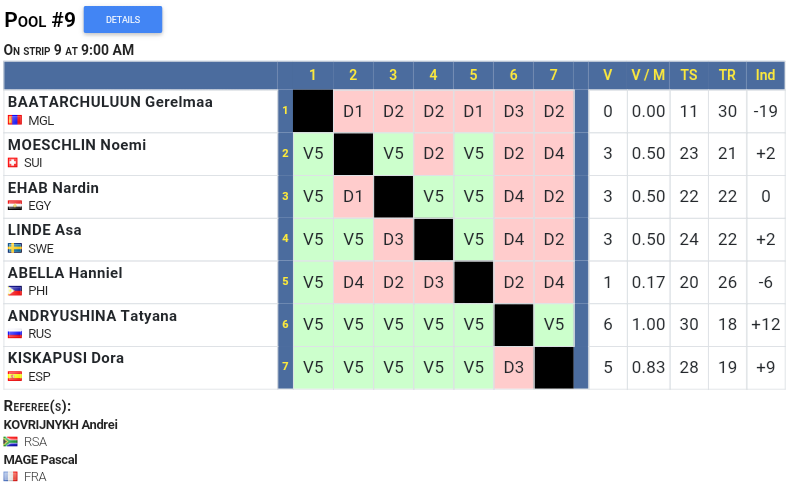 Tras la primera fase de grupo, consiguió 5 victorias con una sola derrota, consiguiendo una brillantísima 14 posición que la clasificó directamente para el cuadro final de 64 el domingo día 22. Con sus compañeras de selección española, las 4 pasaron la ronda de ‘poules’, Alejandra Cisneros (69) e Inés García (88) quedaban eliminadas en su primer cruce, mientras Sara Fernández superaba por 15 a 13 su eliminatoria, entrando con Dora, también entre las 64 mejores.