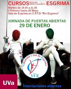 Abierto el plazo de matrícula para el nuevo CURSO UVa en la sala del Río Esgueva. Deja un comentario / Por Valladolid Club de Esgrima / 23/01/2019 Abierto el plazo de matrícula para el nuevo Curso #UVa de #ESGRIMA. El día 29, es de puertas abiertas para quien quiera acercarse y ver de cerca nuestro deporte.Del 5 de febrero hasta el 28 de mayo. Todos los martes de 19.45 a 21.45h.