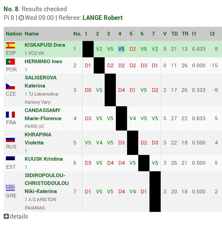 Comenzó la competición en la fase de grupos en la que alcanzó 5 victorias por tan solo una derrota. Venció a la portuguesa Ines Herminio por 2 a 1, a la checa Katerina Saligerova, por 5 a 0, a la francesa Marie Candassamy por 5 a 3, a la estonia Kristina Kuusk por 5 a 3 y a la griega Niki Sidiropoulou por 5 a 1. Tan solo una derrota la separó de la fase perfecta, pero la rusa Violetta Khrapina se impuso por 2 a 5.