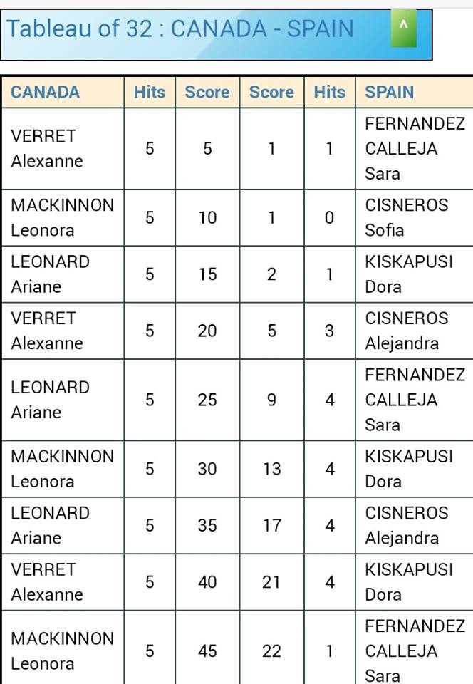 Desafortunadamente el encuentro se puso muy rápido cuesta arriba. Tras los dos primeros relevos de Sara Fernández y Sofía Cisneros, Dora salió a la pista contra Ariane Leonard con un 1 a 10 muy cuesta arriba. Tras un 1 a 5, estaban en contra con un 2 a 15. La cosa pintaba muy mal, pero de cualquier modo trataron en todo momento de levantar la moral e intentar hacer todos los puntos posibles. Perdieron todos los parciales, pero consiguieron al menos hacerlo por 4 a 5. Por fin entraban los tocados, pero no fue suficiente para meterse en el asalto y terminaron cayendo por un contundente 22 a 45 que las dejaba fuera del cuadro de 16 y eliminadas en la posición 17.