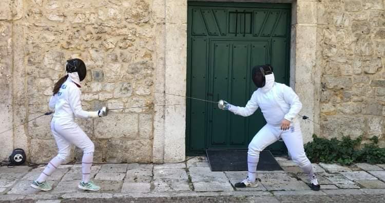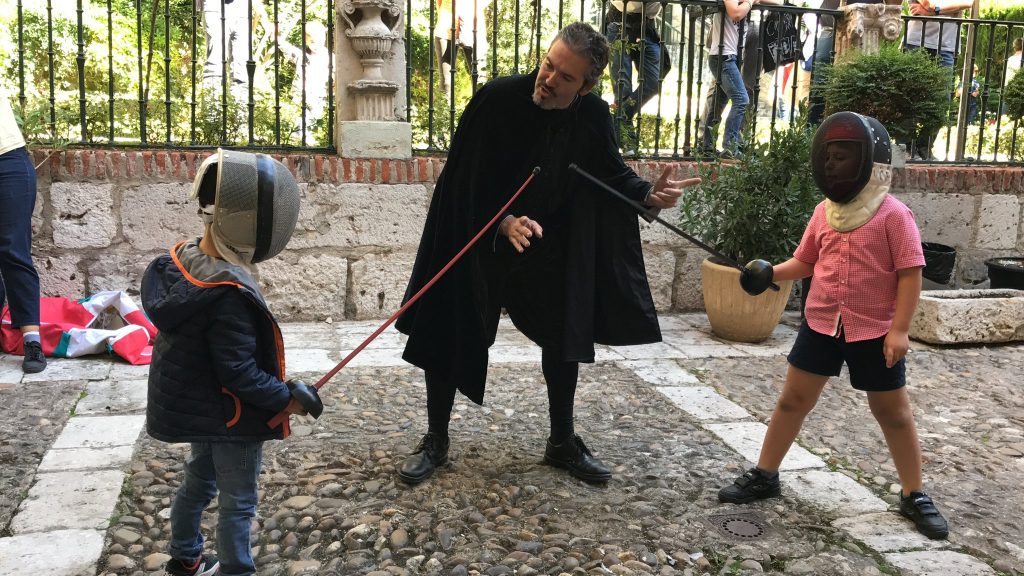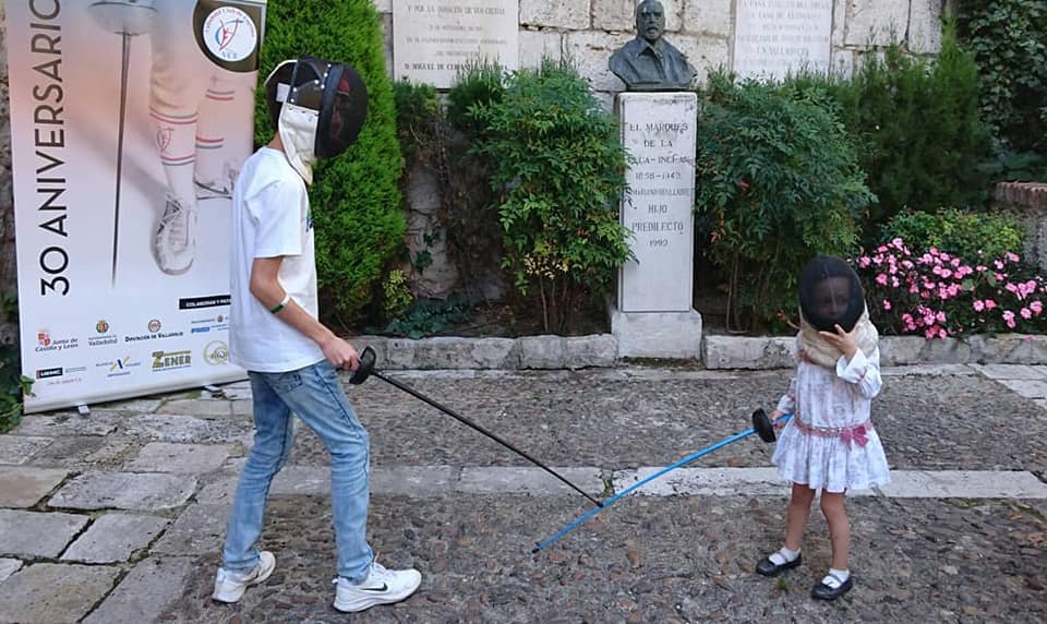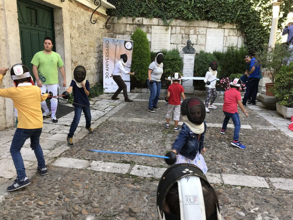 Los jardines del Museo Casa de Cervantes estuvieron animadísimos, las 2 horas que estuvimos enseñando la ESGRIMA. Primero con el duelo Ezpeleta vs. Caballero Negro, luego con la exhibición de esgrima deportiva con Lucía Varela y Fernando Nogués y finalmente, taller abierto donde los niños y adultos de 10 en 10, podían probar las espaditas.