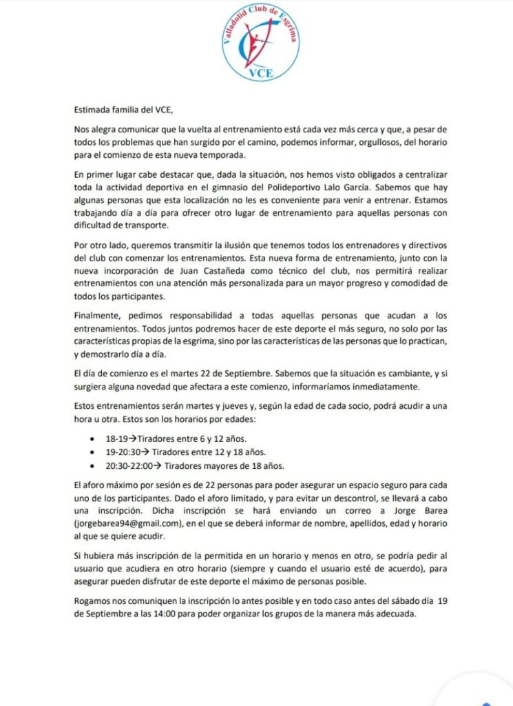 desde el VCE os enviamos un comunicado para informaros de la esperada vuelta a los entrenamientos. Debido a la situación habrá aforo limitado, en el documento adjunto encontraréis toda la información.
