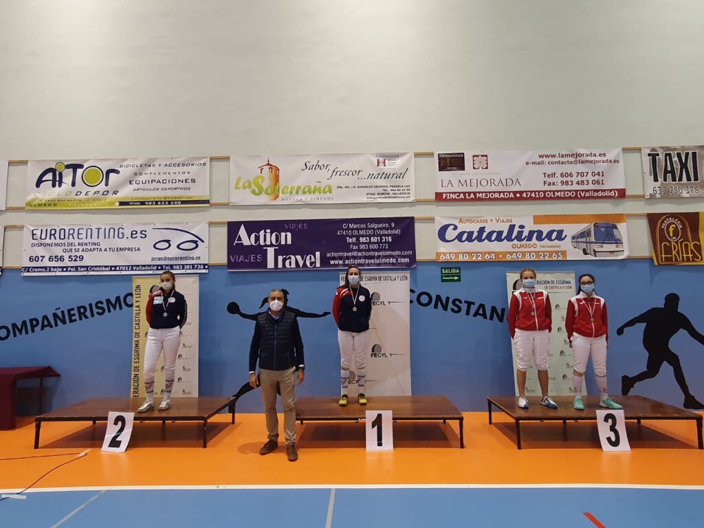 En la categoría Absoluta femenina llegó el segundo oro del día, esta vez para María Mateos donde fue la dominadora de principio a fin, pleno de victorias en las poules, y final disputada a la tiradora salmantina Elena Guerra. Junto a María, su compañera Celia Vañes subió al tercer cajón del podio con la tiradora burgalesa del CID-BU Belén Pedrosa.