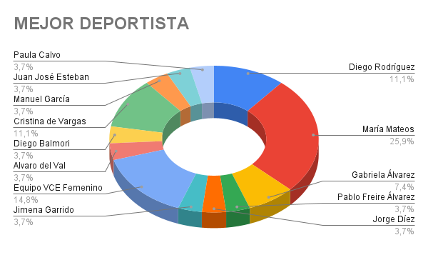 Tras la asamblea, se celebró la fiesta de fin de temporada, donde tuvimos la oportunidad de entregar los Premios VCEST, unos galardones que reconocen el trabajo y el esfuerzo de nuestros deportistas y de aquellas personas que mejor personifican los valores de nuestro club. El premio al mejor deportista de la temporada fue para María Mateos, que gracias a los votos de las personas asociadas se impuso al equipo femenino de espada. El premio al deportista revelación fue para Paula Calvo, que fue ampliamente votada por sus compañeros de club. Por último, Víctor Ballesteros se llevó el premio Familia VCE, un reconocimiento a su trayectoria y compromiso con el club.