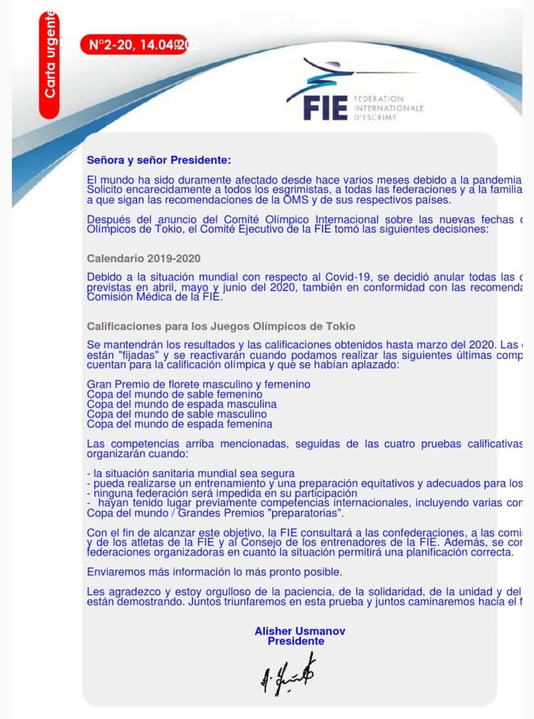 Debido a la situación mundial con respecto al Covid-19, se decidió anular todas las competiciones previstas en abril, mayo y junio del 2020, también en conformidad con las recomendaciones de la Comisión Médica de la FIE.