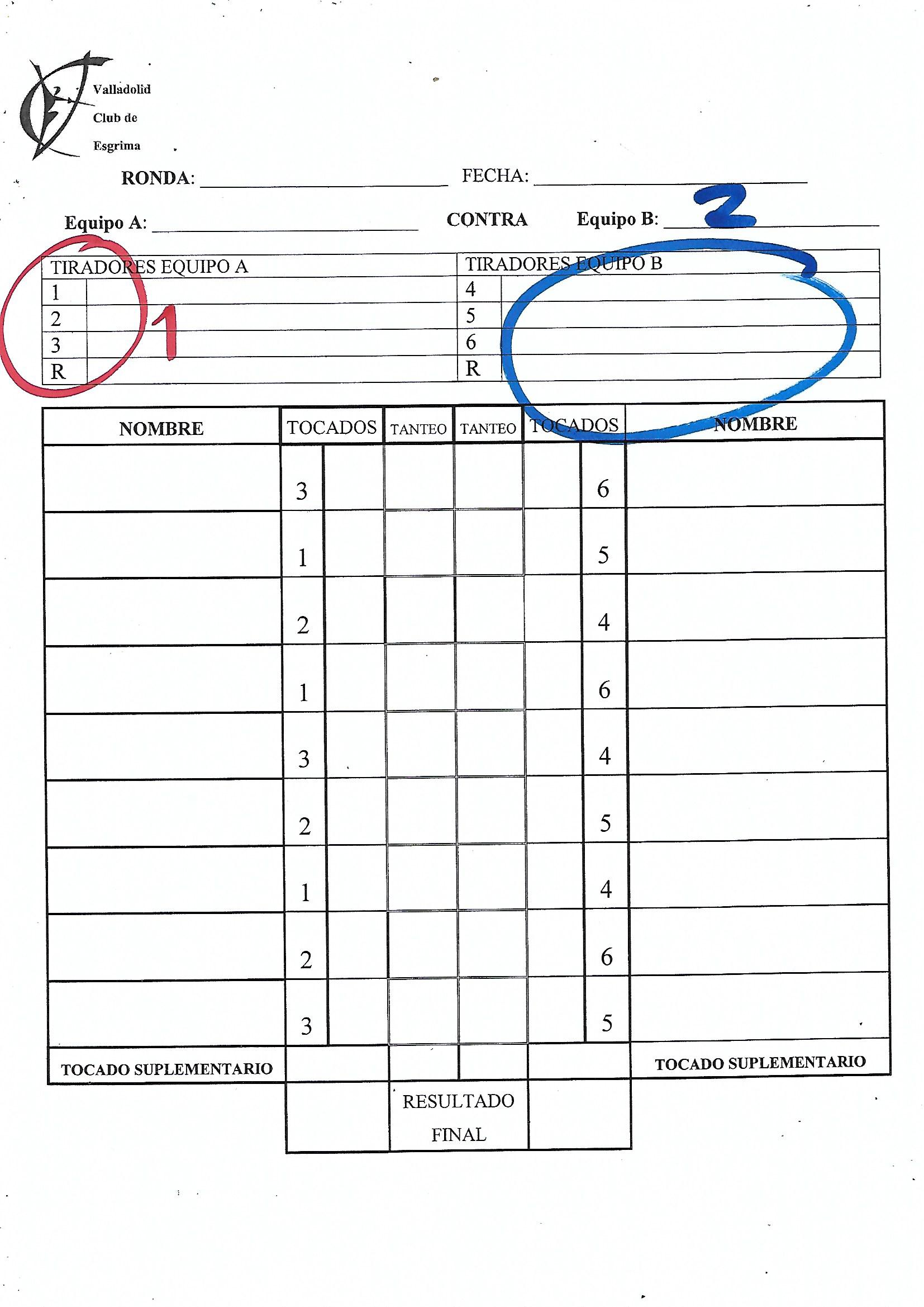 ANEXO 3. Se pondrá especial atención al cubrir las hojas, cubriendo todos los campos RONDA, FECHA, EQUIPO A/B y rellenando correctamente el orden de los tiradores 1, 2, 3 y R (reserva en el caso de estar formado el equipo por 4 miembros) (*Hoja: 1). En el espacio reservado a los TIRADORES (*Hoja: 2), se rellenará con el NOMBRE y el PRIMER APELLIDO de cada uno. Posteriormente será suficiente con poner el nombre de cada tirador al momento de cubrir los asaltos.