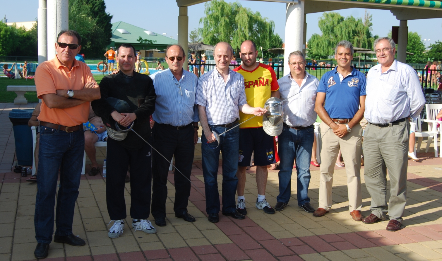 Presidente de la Asociación de Federaciones Deportivas de Castilla y León, (AFEDECYL), Daniel Bravo, Presidente de la Federación de Esgrima de Castilla y León, y los anfitriones, Andrés Rubio, Presidente, Manuel Vázquez de Prada, Gerente e Ignacio de la Cuesta, Vocal de la Real Sociedad Hípica de Valladolid.