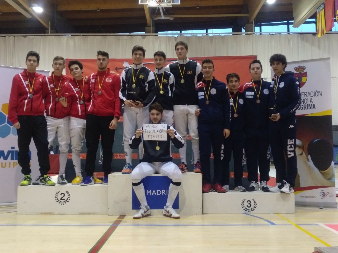 El mismo sábado por la tarde, el equipo JUNIOR M20, formado por Bermejo, Nieto, Alarcia y Nogués, que se ganó brillantemente la clasificación para este CAMPEONATO DE ESPAÑA, ya entre los 4 mejores nacionales, tenía un difícil cruce contra el Olímpico de Madrid. El asalto fue siempre en contra del VCE, con ventajas entre 8 y 12 tocados por abajo, pero en el último relevo con Noé Bermejo ante Calderón, con un 30 a 39 para los de Madrid, Noé hizo creer a sus compañeros en la remontada, con un parcial 12 a 6, que dejó la eliminatoria en un 45 a 42. Ahora tocaría luchar por el BRONCE contra el Europeo de Madrid. Con los primeros asaltos muy ajustados y un tanteo de 19 a 19, Dani Alarcia y Guille Nieto con unos relevos favorables pusieron la diferencia primero en 3 y luego en 5 puntos, que Noé también supo mantener hasta un 45 a 39 final que Guille Nieto mantuvo ante Javier Fernández y que les dio el BRONCE al VCE, con Fernando Nogués como suplente y como el cuarto miembro del equipo. Tras esta exitosa clasificación, el VCE ya es el 3º equipo Junior de España.