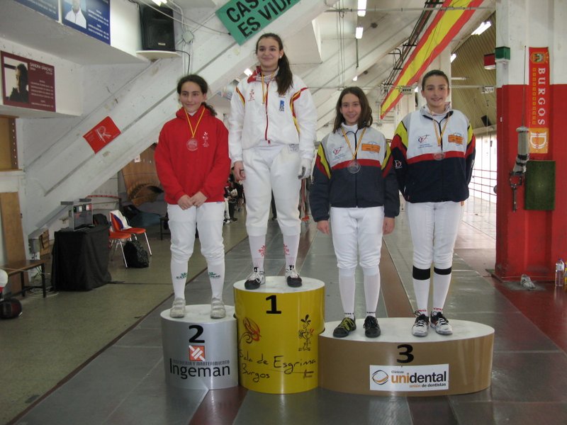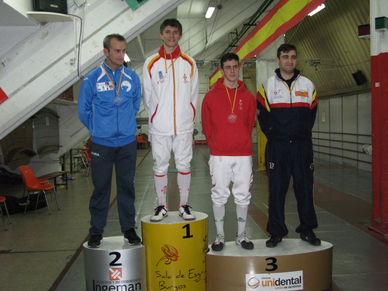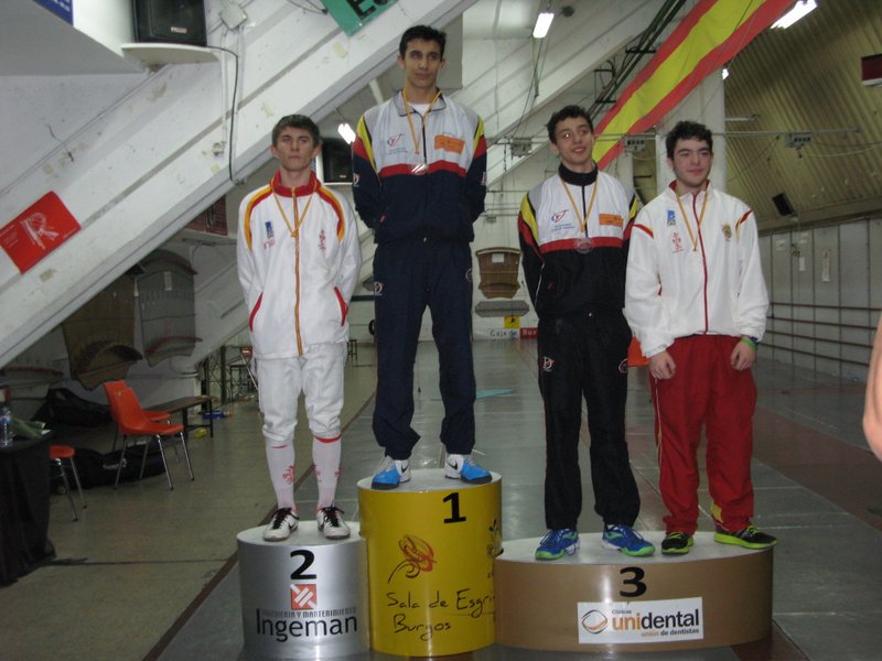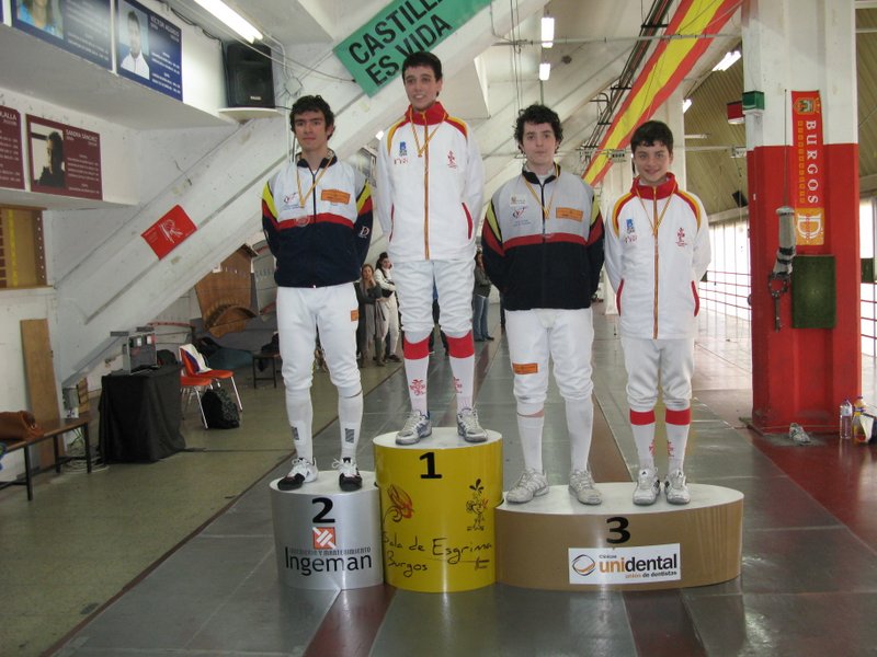 La categoría cadete deparó más alegrías para el Valladolid Club de Esgrima siendo ambos campeones del torneo del VCE. En espada femenina María Mateos alcanzó el oro venciendo a Inés Martín en la final que se tuvo que Podio EM M17 VTRRconformar con la plata y en espada masculina el oro colgaba del cuello de Guillermo Nieto que derrotaba en la final a Rodrigo Alegre de la Sala de Esgrima de Burgos. Uno de los bronces fue a parar a manos de Diego Balmori.