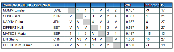 María consiguió una victoria en la fase ‘poule’ ante la estonia Nelli Differt por 5 a 3 que no le resultaba suficiente para clasificarse para las eliminatorias.
