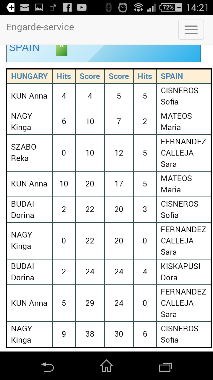 En asalto bastante equilibrado en la que España llegó a estar por delante en un par de ocasiones, llegaron al último relevo empatadas gracias a un parcial de 4 a 2 de Dora Kiskapusi que dejaba el tanteo en un empate a 24. Un 0 a 5 en contra con Sara Fernández en pista dejó el tanteo en 24 a 29. En el último relevo con Sofía Cisneros con la responsabilidad de remontar, las húngaras impusieron un parcial de 9 a 6 para derrotar a nuestra selección, que finaliza así en la posición 16, la misma con la que llegaba a Tallin, por lo que mantiene su posición en el ranking, una posición de privilegio entre las mejores del mundo.