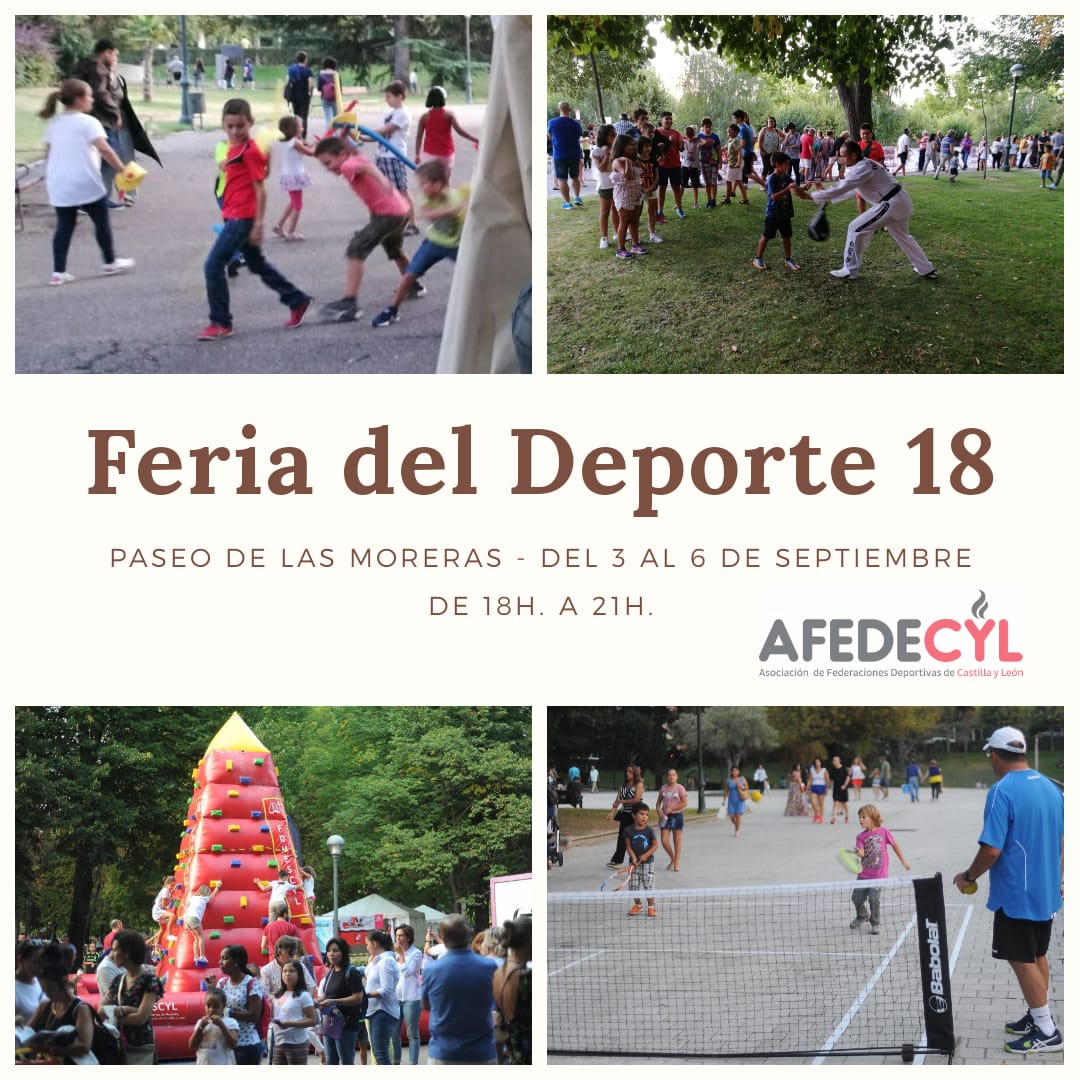 La AFEDECYL y el Ayuntamiento de Valladolid vuelven a unirse para organizar la III FERIA del DEPORTE. El evento, que tendrá lugar en el Paseo de Las Moreras desde el 3 al 6 de septiembre en horario de 18 a 21 horas, celebrará múltiples actividades deportivas junto a las Federaciones Deportivas de Castilla y León de Bádminton, Esgrima, Espeleología, Gimnasia, Montaña, Taekwondo, Tenis, Triatlón y Tiro con Arco.