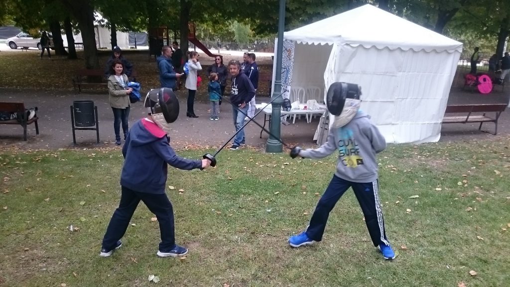 Los sables de espuma para los más pequeños y los espadetos de plástico (gran éxito) junto a las caretas como protección, proporcionaron a nuevos esgrimistas y a sus familias un rato muy agradable, donde poder jugar con las espaditas.