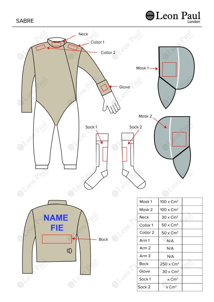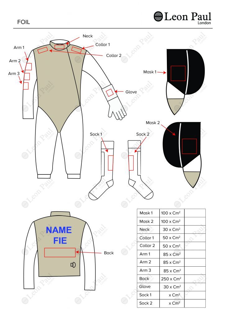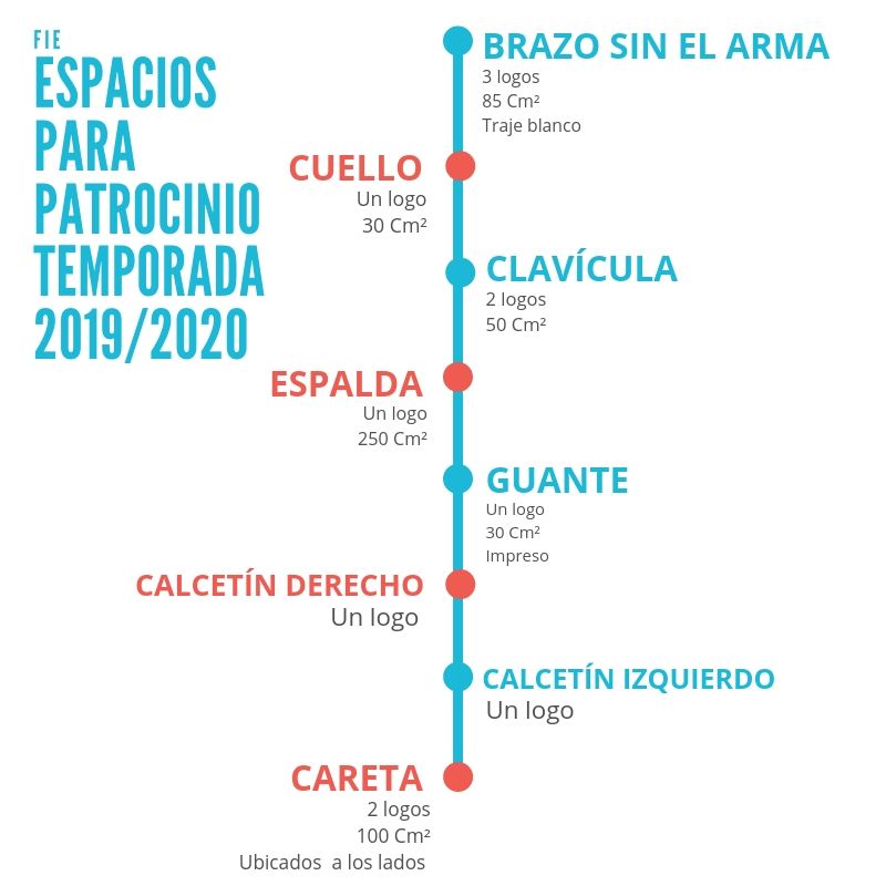 Tener claras esas posibilidades serán claves a la hora de sacar un mayor rendimiento de ellas. Si una federación o un esgrimista firman un contrato de patrocinio con una empresa comercial, el logotipo de ese socio patrocinador puede fijarse en las siguientes ubicaciones y con estas medidas máximas: