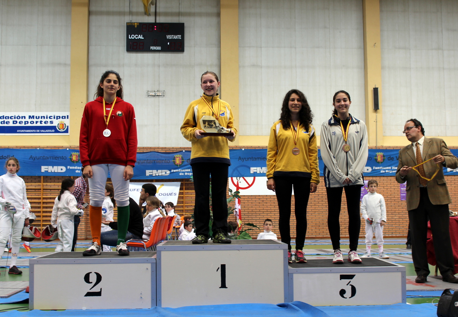 IMG_6352Celia Ibáñez, de la Sala de Armas de Madrid, se proclamó campeona en la fase femenina. Patricia López, una tiradora del Club de Esgrima de Galicia de Coruña, la seguía en la clasificación, y los bronces se los colgaron Lucía Heras, también de la SAMA, y Victoria Pañeda, de la Castellana Sala de Armas de Madrid.
