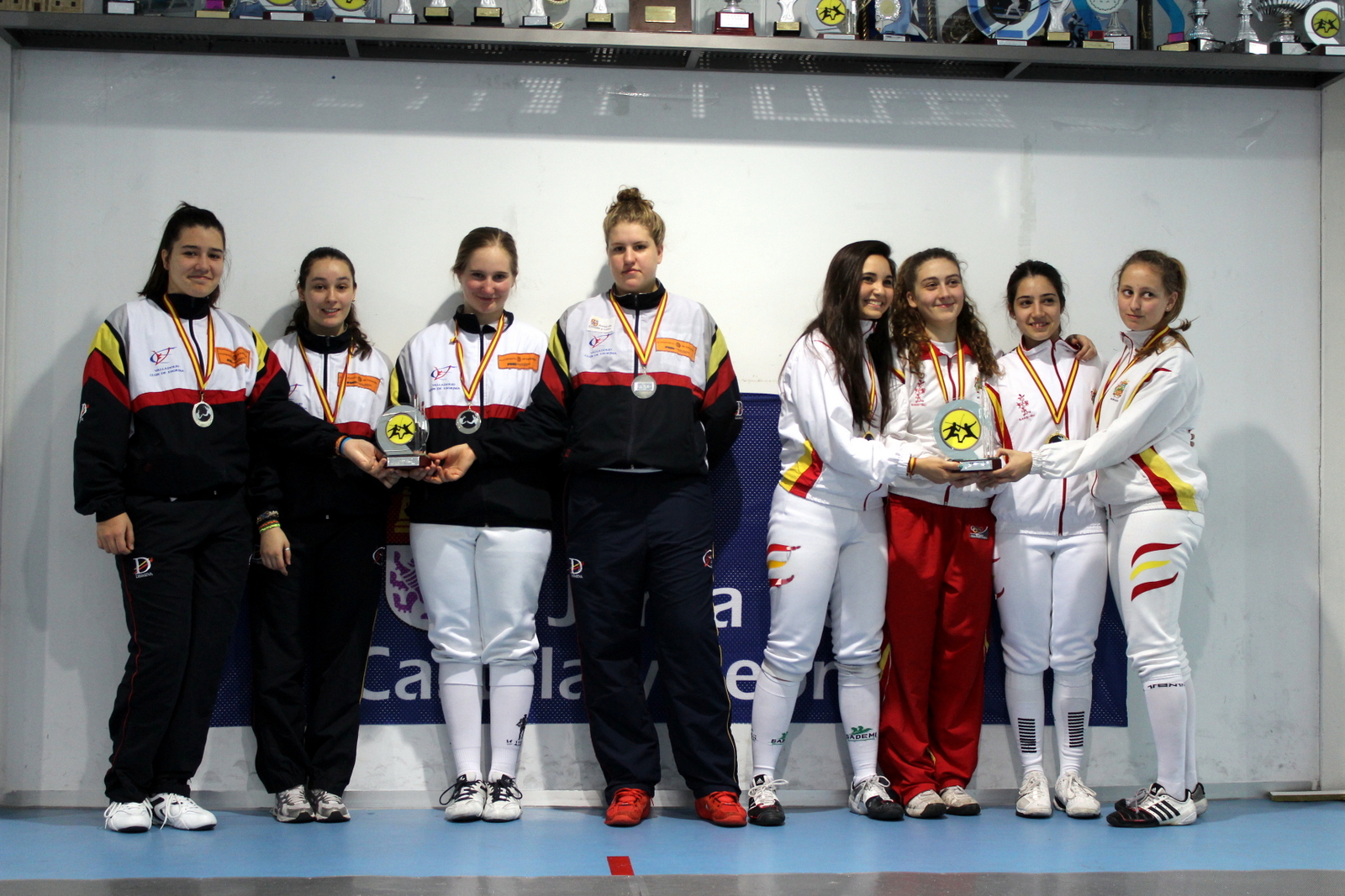 Seguidamente continuaron las pruebas de equipos en ambas categorías M-20 y Absoluta. En la categoría Junior, tanto masculina como femenina, los triunfos fueron para la Sala de Armas de Burgos. En la prueba masculina vencieron con autoridad, 45-29, al equipo formado por Jaime de la Fuente, Miguel Pírez, Adrián Yáñez y David Alarcia, en tanto que la prueba femenina el resultado se tuvo que dirimir en la prioridad llevándose Burgos el oro con el marcador 34-33. El equipo vallisoletano estaba formado por Macarena Centenera, Elisa Martínez, Irene Losada e Inés Martín.