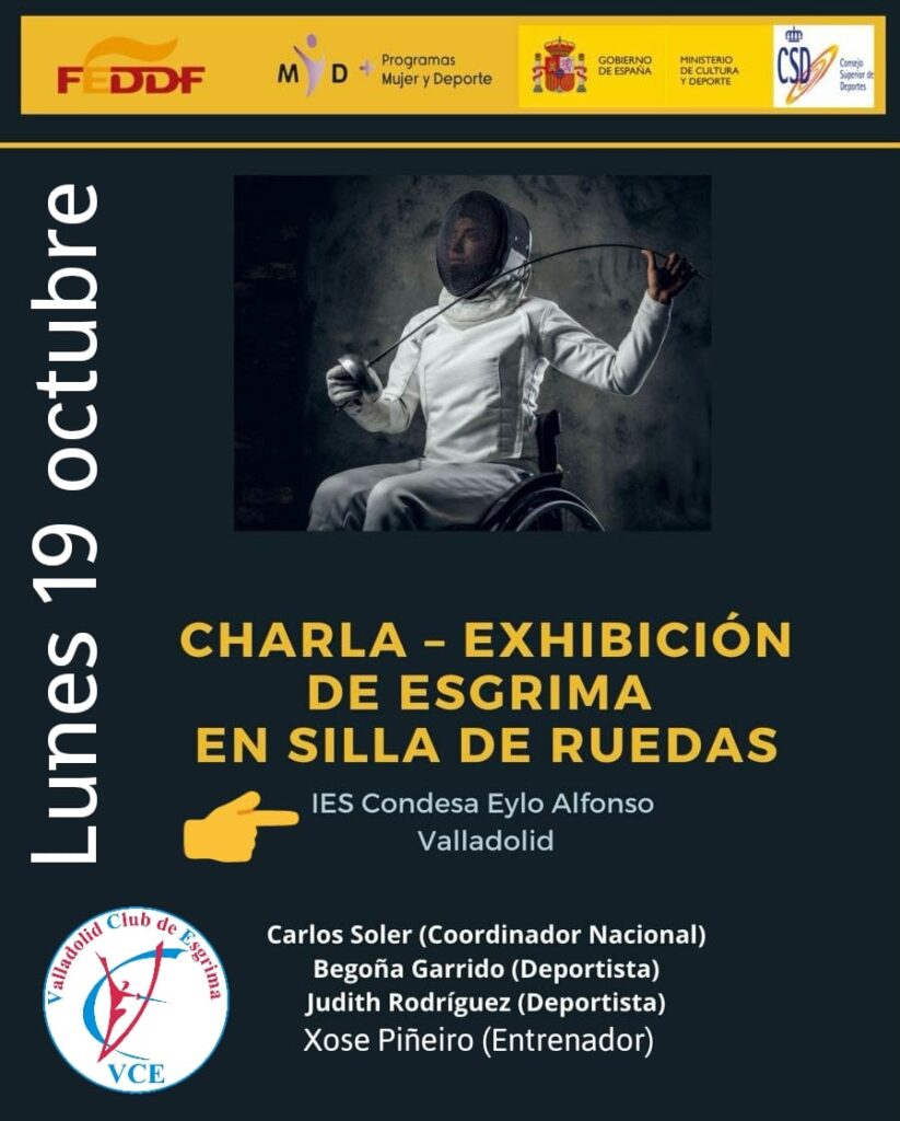 El lunes 19 de octubre, charla-exhibición de ESGRIMA  para alumnado de TAFAD del Instituto Condesa Eylo. La charla y la exhibición pertenecen a los PROGRAMAS MUJER y DEPORTE.  Judith Rodríguez del Esgrima Vigo El Olivo y nuestra Bego Garrido serán las dos deportistas, con el coordinador nacional de Esgrima Adaptada y otro VCE, Xose Piñeiro como entrenador
