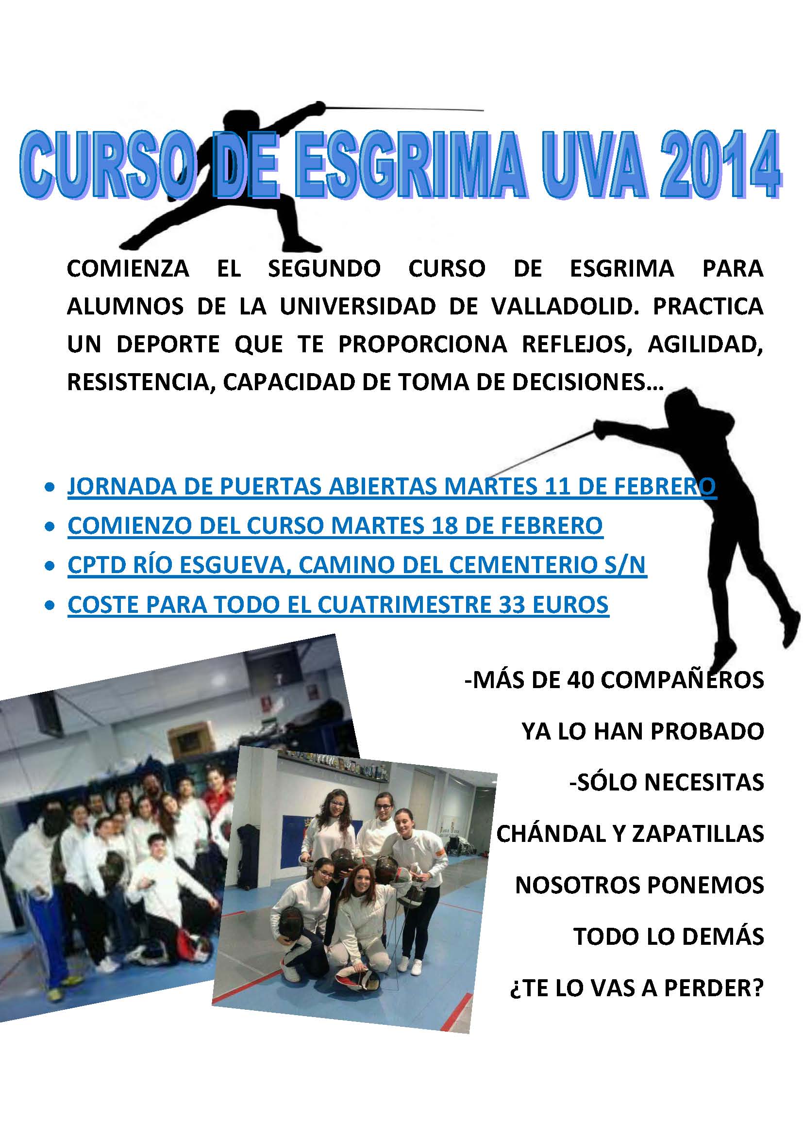Nuevo curso para universitarios Deja un comentario / Por Valladolid Club de Esgrima / 04/02/2014 El día 11 los universitarios tienen la oportunidad de probar nuestro deporte. Como seguro les va a gustar, se hará después un curso para que se adentren en sus secretos. ¡¡Ánimo!!