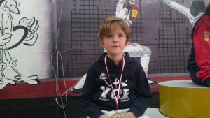 La categoría de los más pequeños la PREBENJAMÍN mixta (M8), contó con la participación de Samuel Álvarez y Álvaro del Val. Tras una buena primera fase con 3 victorias cada uno, en la lucha por las medallas, les tocó enfrentarse uno con el otro. La victoria fue para Álvaro que se clasificó para las semifinales donde se ganó el BRONCE, tras caer con el campeón Alberto Martín por un ajustado 10 a 9. Samuel finalizó el 6º.