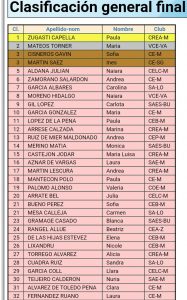 La espada femenina, comenzaba con María Mateos y Naiara Moreno. Tras la fase de grupo, Naiara consiguió 3V por 3D. María con 4V y 1D, pasaba con él número 5. Tras las primeras eliminatorias, las dos se clasificaban para el cuadro de las 8 mejores. Así María vencía a Sandra Cuadra de Logroño y a Andrea Ruiz de Pozuelo-M, mientras que Naiara daba cuenta de Paula Mantecón del Madrid y de Paula López del Barajas.