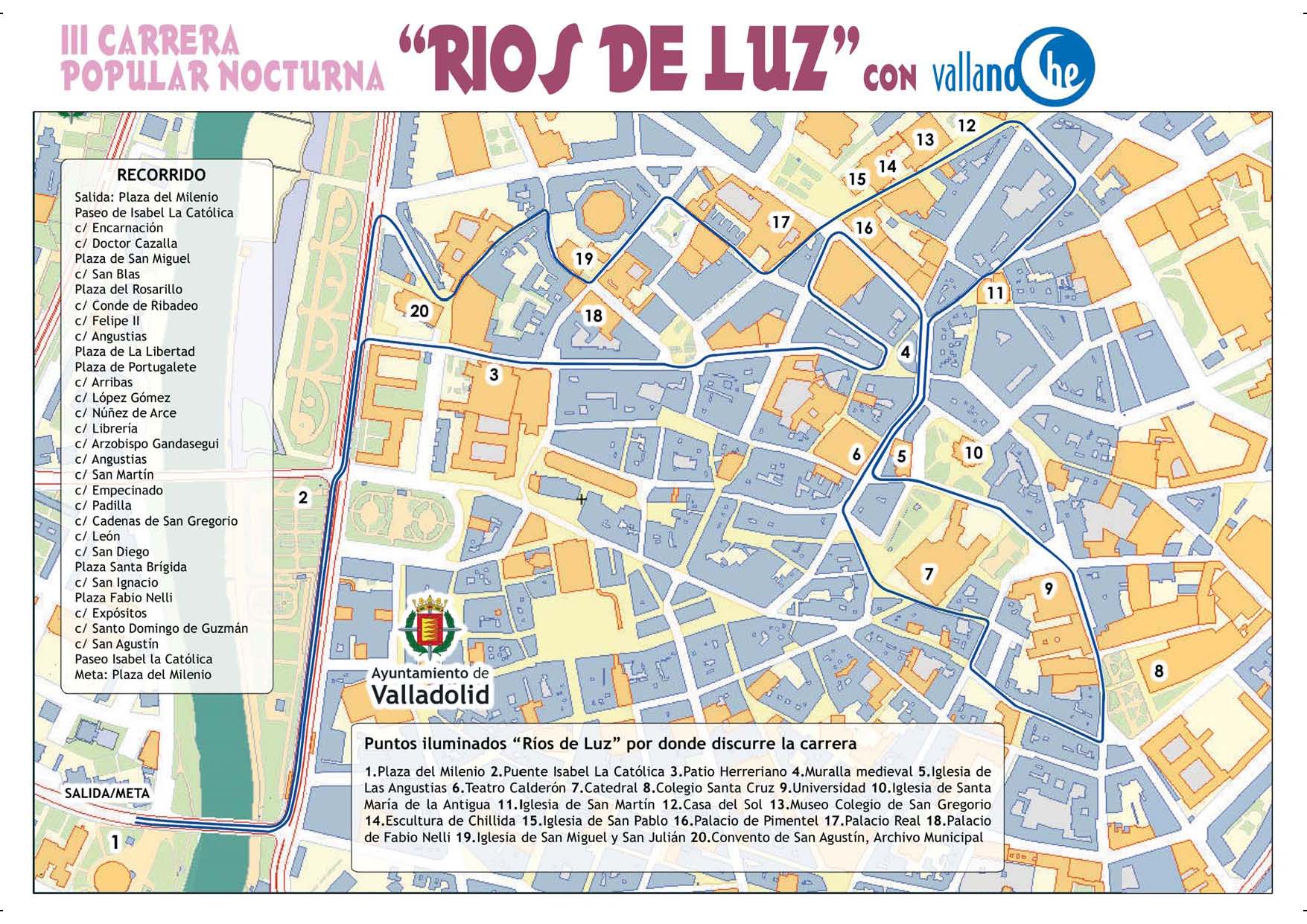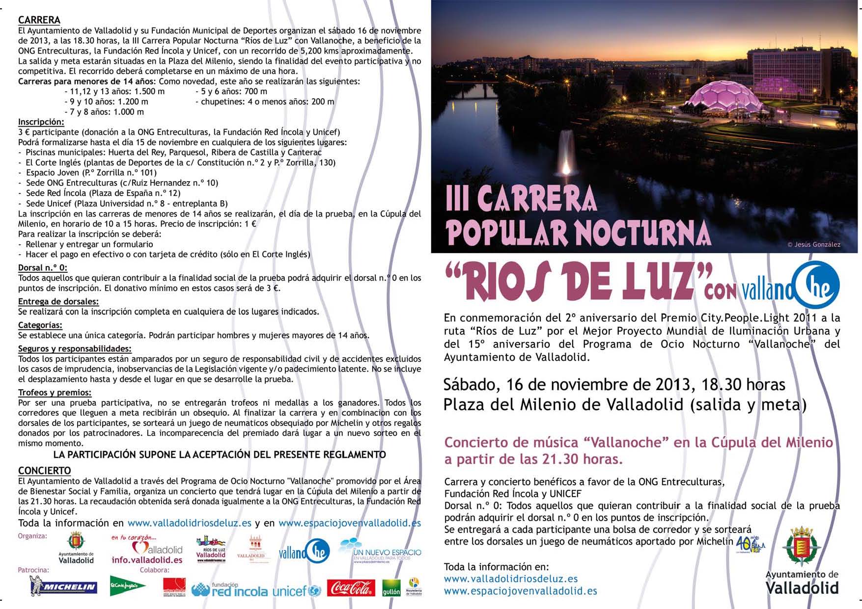 Cartel III Carrera Popular Nocturna "Ríos de Luz"Con motivo de la celebración del segundo aniversario de la concesión al Mejor Proyecto Mundial de iluminación Urbana «Ríos de Luz», el 16 de noviembre se celebrará la III Carrera Popular Nocturna «Ríos de Luz». En ella podréis recorrer las mejores estampas de Valladolid iluminadas de forma impresionante. ¡¡¡Espectáculo sin igual, animaros todos!!!