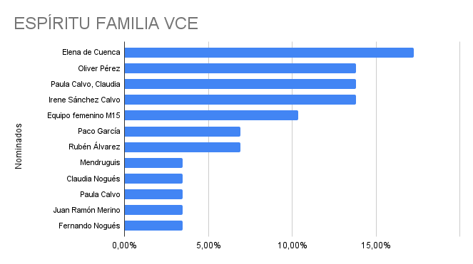 El premio al Espíritu Familia VCE es un reconocimiento a aquellos que encarnan los valores de nuestro club. Enhorabuena a Elena de Cuenca que ha logrado el premio más disputado. Un solo voto marcó la diferencia con Óliver Pérez, Irene Sánchez y el grupo conformado por Paula Calvo, Alba Fernández y Claudia Nogués.