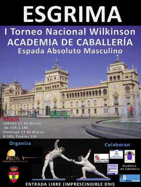 Este próximo fin de semana, 12 y 13 de marzo,  se disputa en Valladolid el V Torneo Nacional de Ranking de la Liga nacional de espada masculina en las bellas instalaciones de la Academia de Caballería de Valladolid. La prueba estaba prevista en Salamanca, pero finalmente la falta de disponibilidad económica ha hecho que la Federación de Esgrima de Castilla y León se haya hecho cargo de la organización del Campeonato en Valladolid.