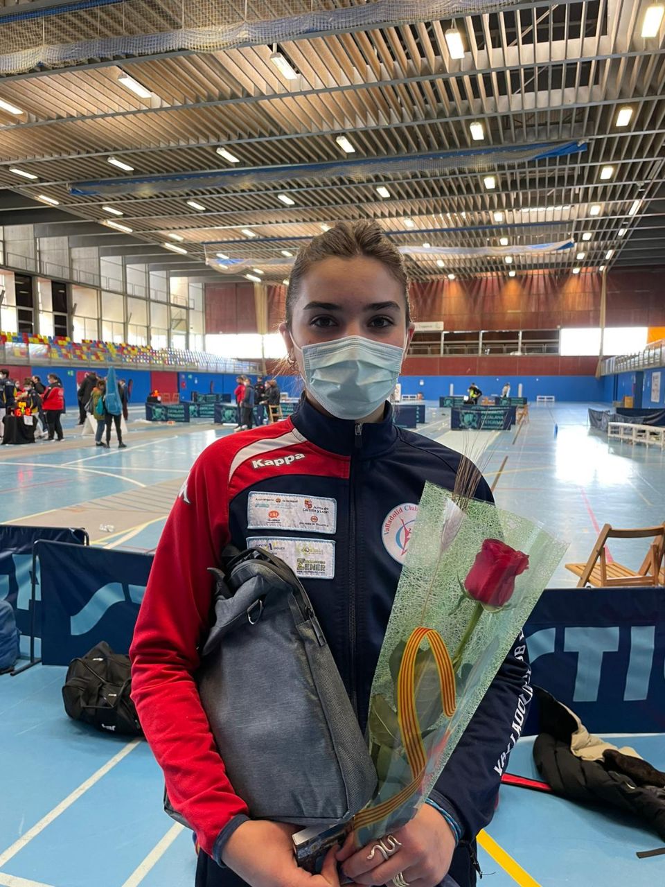 La subcampeona de Castilla y León infantil del Valladolid Club de Esgrima confirma su progresión también a nivel nacional tras lograr el oro el fin de semana pasado en el torneo regional de Villalbilla. En el día de hoy ha exhibido una esgrima de mucha calidad tras haber pasado la poule invicta y tras solventar sus cruces del tablón de 32 y de 16 con mucha autoridad. Finalmente, la número 4 del ranking nacional, Julia Rueda (SA-GR), impidió su pase a semifinales logrando, de este modo, acabar en una excelente quinta posición.
