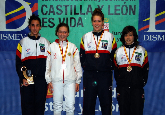 En semifinales, Macarena Centenera y Teresa Delgado ofrecían un bonito espectáculo para el Dismeva, con victoria para Teresa por 15 a 13, dejando a Macarena con el bronce. En la otra semifinal Carla Martínez no podía tampoco con la burgalesa Pérez y perdía por 8 a 15, colgándose el otro bronce. En la final incertidumbre hasta el último momento, con victoria en la prioridad por un solo tocado, 9 a 8, para Teresa Delgado ante Flavia Pérez, llevándose la victoria y el oro.