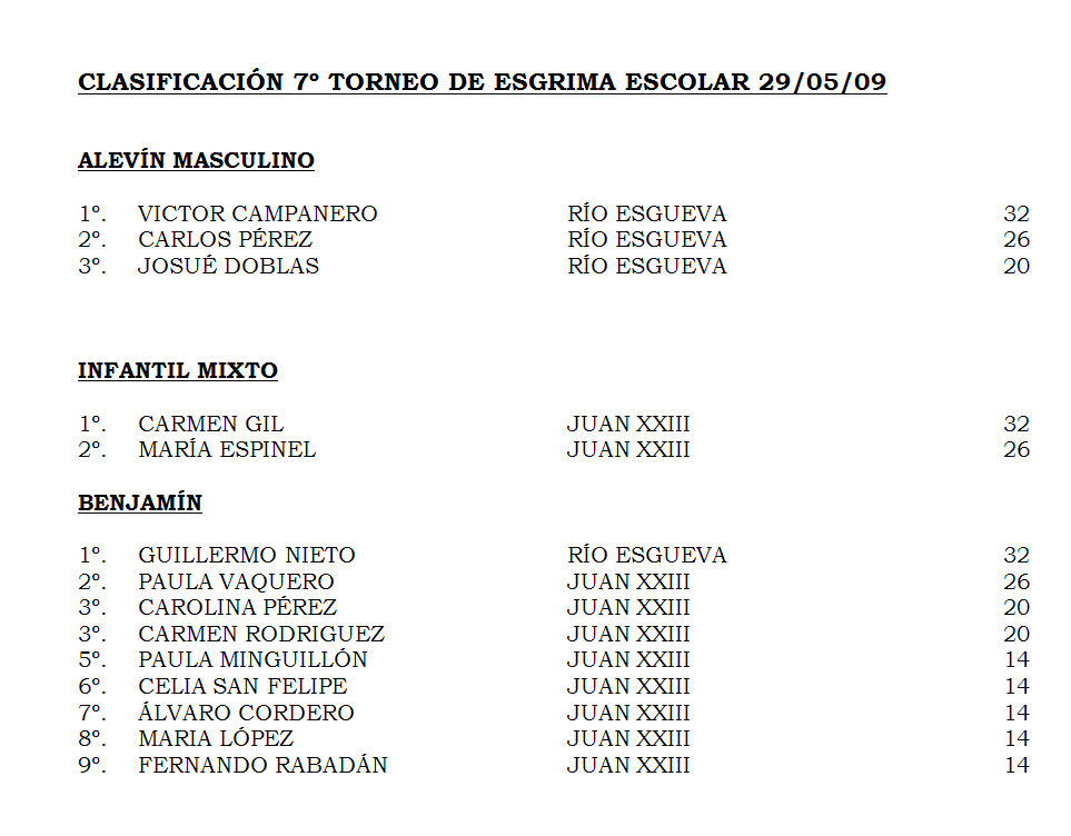 El viernes 29 de Mayo, tuvo lugar en las instalaciones del CPTD, el VII Torneo de Esgrima Escolar. En él participaron alumnos de Río Esgueva y Juan XXIII. Ejercieron como árbitros Dóra Kiskapusi, Juan Izquierdo, Pablo Vaquero, Guillermo González, Rita Mato y Laura Lozano. Susana Blanco fue la directora técnica. Los resultados en la página de «Club».