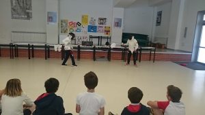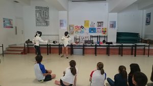 La pequeña exhibición en el patio, pretendía mostrar también a las familias como se desarrolla un asalto de esgrima en competición.